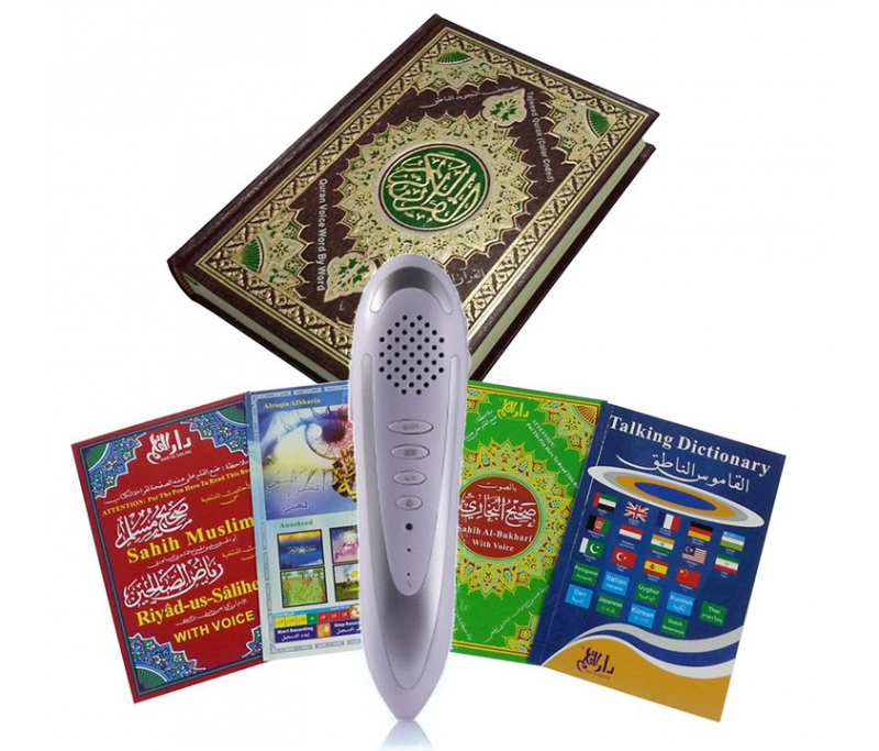 Avec le Saint Coran fourni le stylo optique peut lire chaque verset, sourate ou toute une page de façon simple. Peut également lire les cartes de menu (des fonctions) et le livre de l’apprenant (contenant les invocations et les cours de langue arabe), la qa’ida nourânia (القاعدة النورانية), et tous les autres livres (hadiths, dictionnaire, etc.)